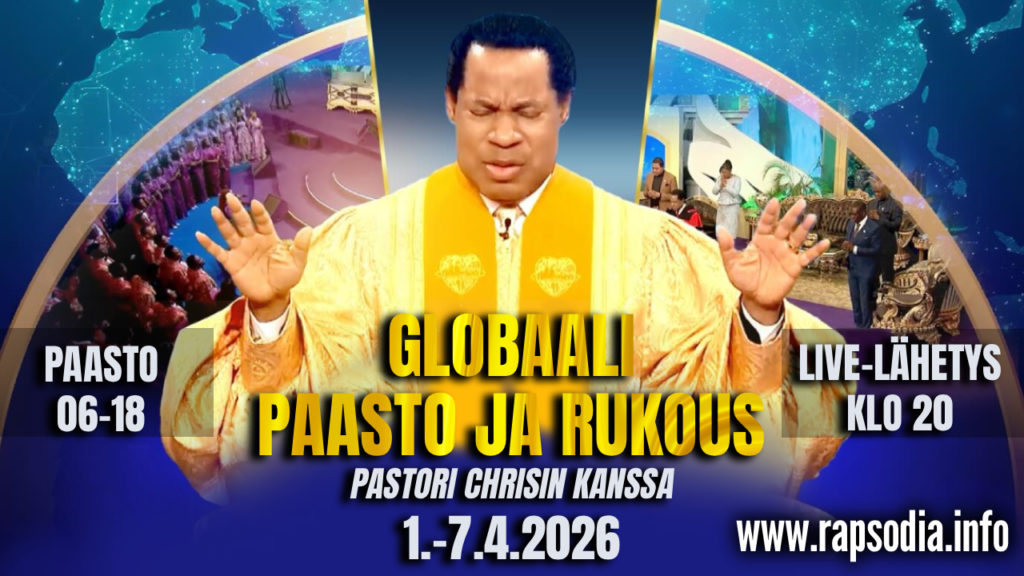 Helmikuun paaston ja rukouksen aika Pastori Chrisin kanssa järjestetään 24.-26.2.2026 (TI – TO). Paastoaika on päivittäin klo 06:00-18:00. Iltaisin kokoonnumme yhteen klo 19:00 rukoilemaan Pastori Chrisin johdolla. Tervetuloa mukaan tekemään muutoksia maailmaamme rukouksiemme kautta! Tulkkaamme nämä klo 19 alkavat live-lähetykset suomeksi ja pääset osallistumaan niihin osoitteesta: www.rapsodia.info