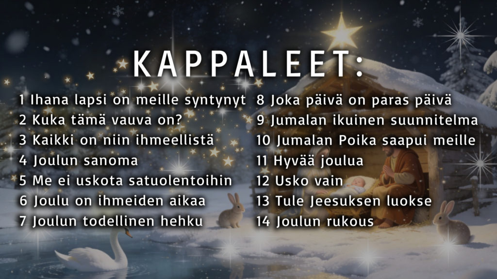 Rapsodia-tiimi on luonut 14 täysin uutta, raamatullista ja sydämellistä joululaulua, joissa joulun todellinen sanoma soi kirkkaana ja iloisena. Sanat on kirjoitettu huolella Raamatun totuuden mukaisessa linjassa ja moderni, lämmin soundi on syntynyt tekoälyn ja ihmisäänen kauniissa yhteistyössä.